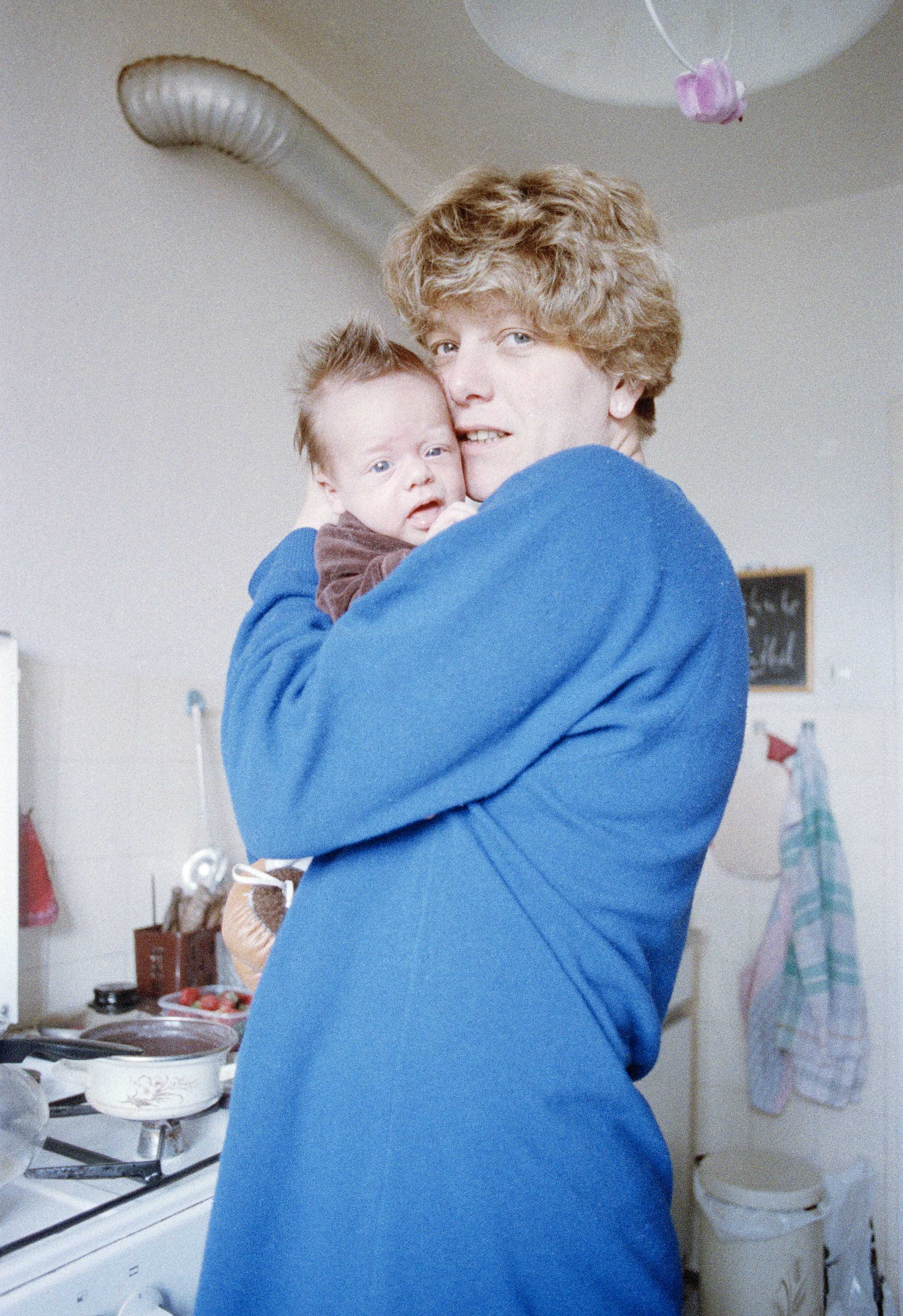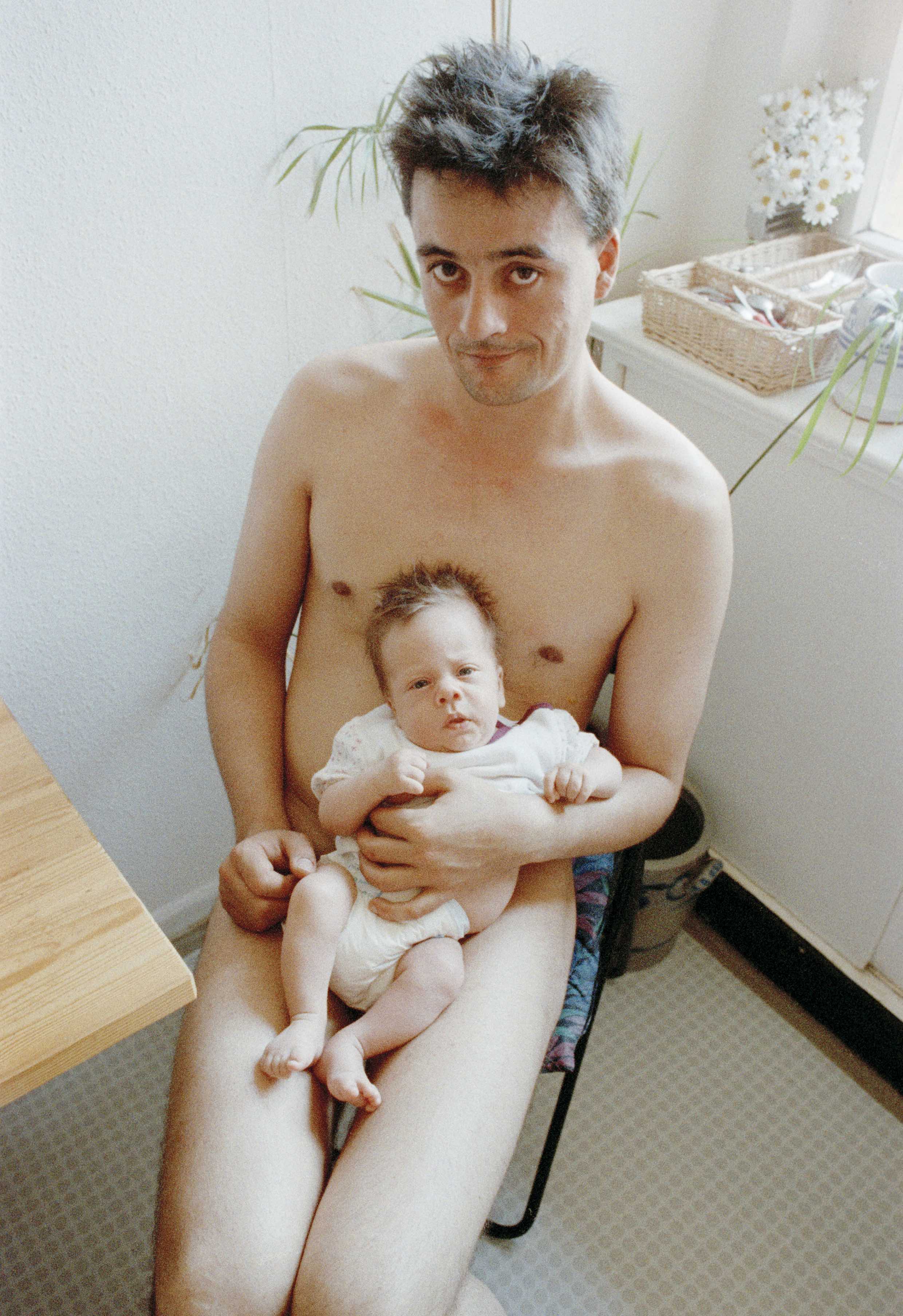 Die vier Fotografien erweckten besondere Aufmerksamkeit in mir. Meine (frischgewordenen) Eltern posieren mit meinem Bruder David vor der Kamera. Mama fotografierte Papa: nackt auf einem Stuhl sitzend, David auf seinem Schoß und neckisch nach oben in die Kamera blickend. Papa fotografierte Mama: im blauen Pulli, mit dem schreienden Kind auf dem Arm, das sie nicht davon abhält, ruhig und bestimmt in die Kamera zu schauen.