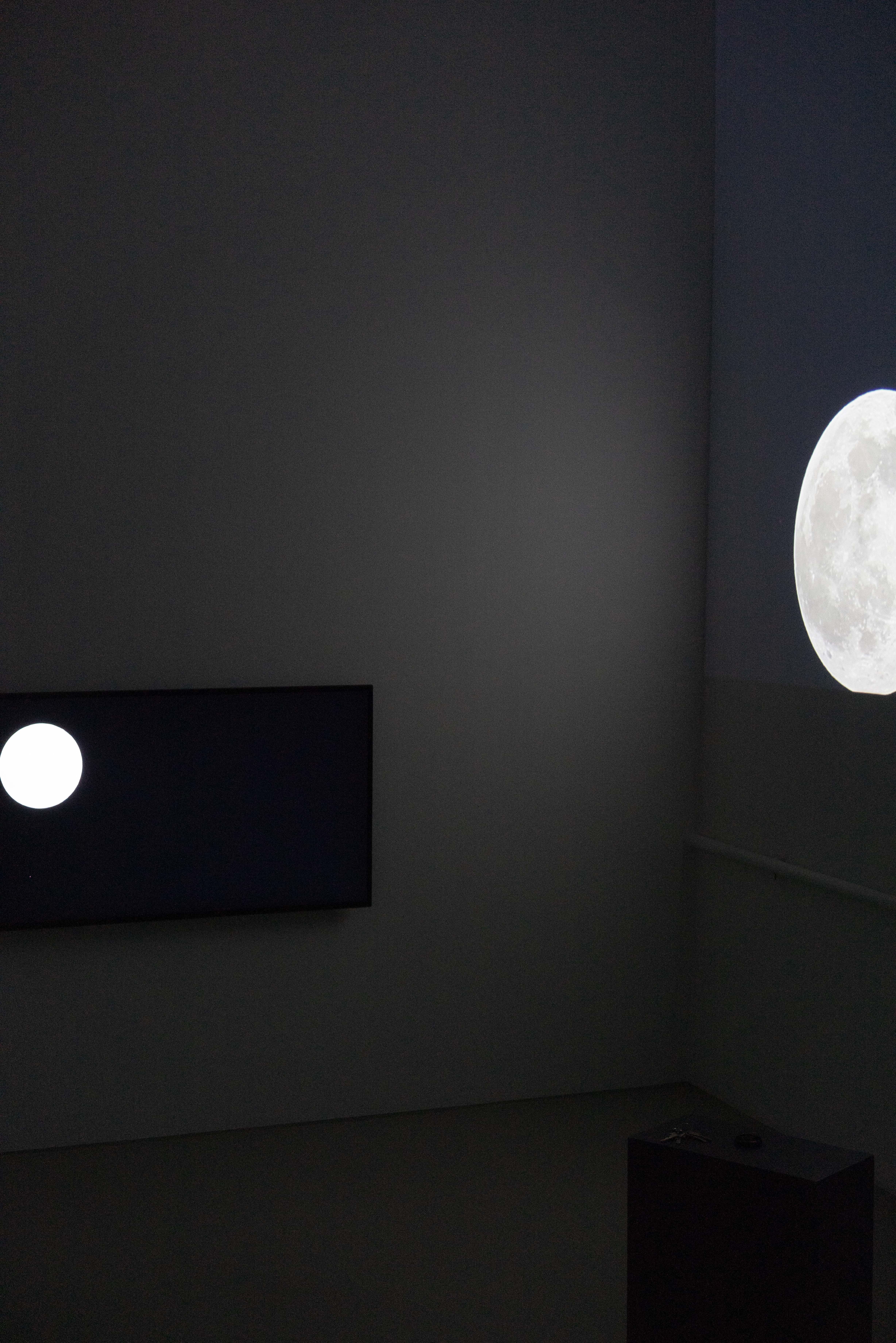 14 Minuten, 52 Sekunden. So lange benötigt der Mond, um von einem Ende der Ausstellungswand zum anderen zu gelangen. Für Mond, durch Bild wandernd hat Meuresch den Vollmond mit statischer Kamera gefilmt. Sein langsamer, fast nur am Bildrand wahrnehmbarer Gang entspricht in der Realität einer Geschwindigkeit von etwa einem Kilometer pro Sekunde. Was bei längerem Betrachten auffällt, ist das gleichbleibende Aussehen des Mondes. Das Phänomen ist schnell erklärt: Da der Mond für das Umkreisen der Erde genauso viel Zeit benötigt wie für das Rotieren um die eigene Achse, wendet er uns immer dieselbe Seite zu. Sein Kreisen um die Erde entspricht damit der Bewegung einer Fotografin, die um ihr Modell kreist, um es von allen Seiten aus zu fotografieren. In der Nacht, könnte man sagen, macht uns der Mond alle zu Stars.