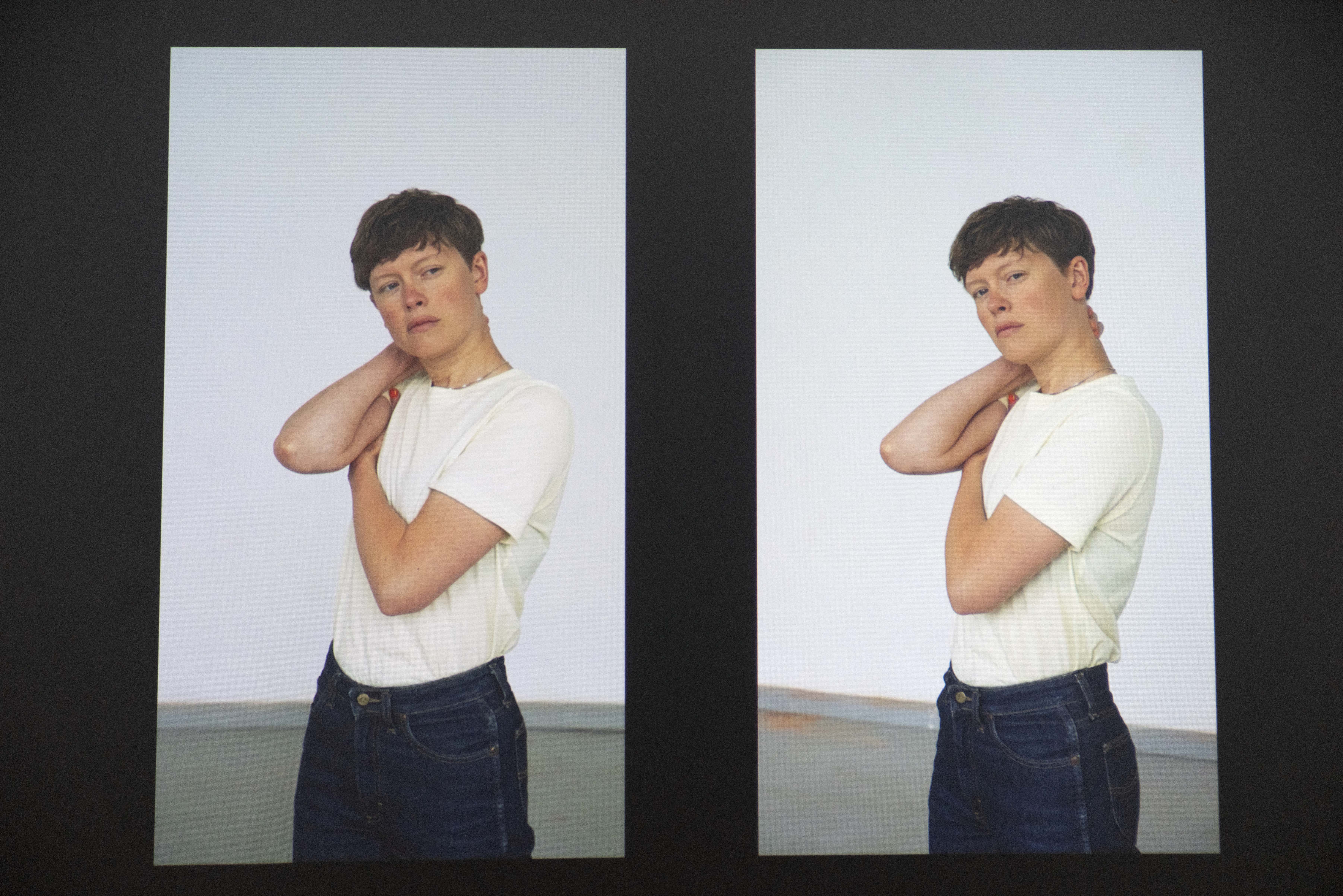For Astrid (Doppel), Meuresch filmed a model with two slightly offset cameras and gave instructions for different poses. In the context of the exhibition, the work is irritating in a special way. The object of observation here is not a faceless object, but a human being looking back at us. The doubling of perspective creates a very unique logic of seeing: While we can decide at any moment whether to look to the left or to the right, whether to avoid the model’s look or to seek it, Astrid always seems to do both at the same time. Even when she is not looking at us, she is looking at us. While the title of the exhibition can be read as an allusion to Rilke’s „wachsende Ringe,“ Astrid (Doppel)recalls another famous verse by the poet: „for there is no part of it / that does not see you. You must change your life.“